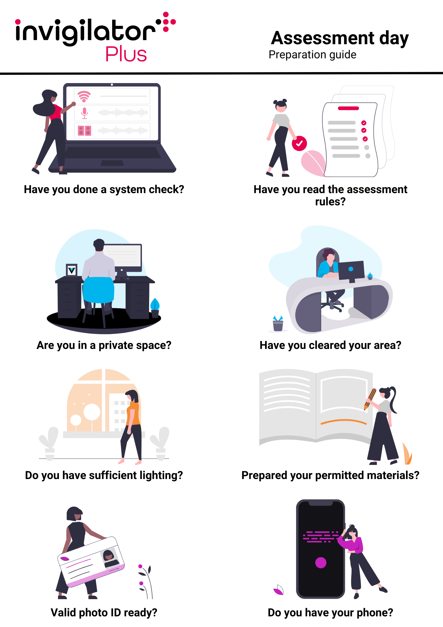 CampusQ provides videos and customisable templates for online and print guides to help prepare your students for their invigilatorPlus exam.